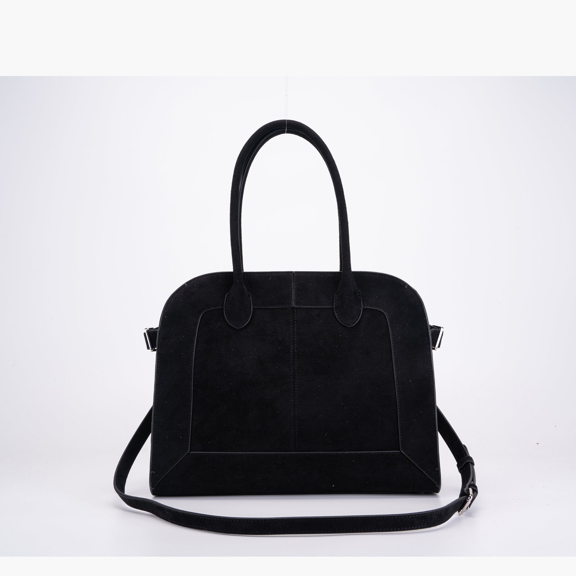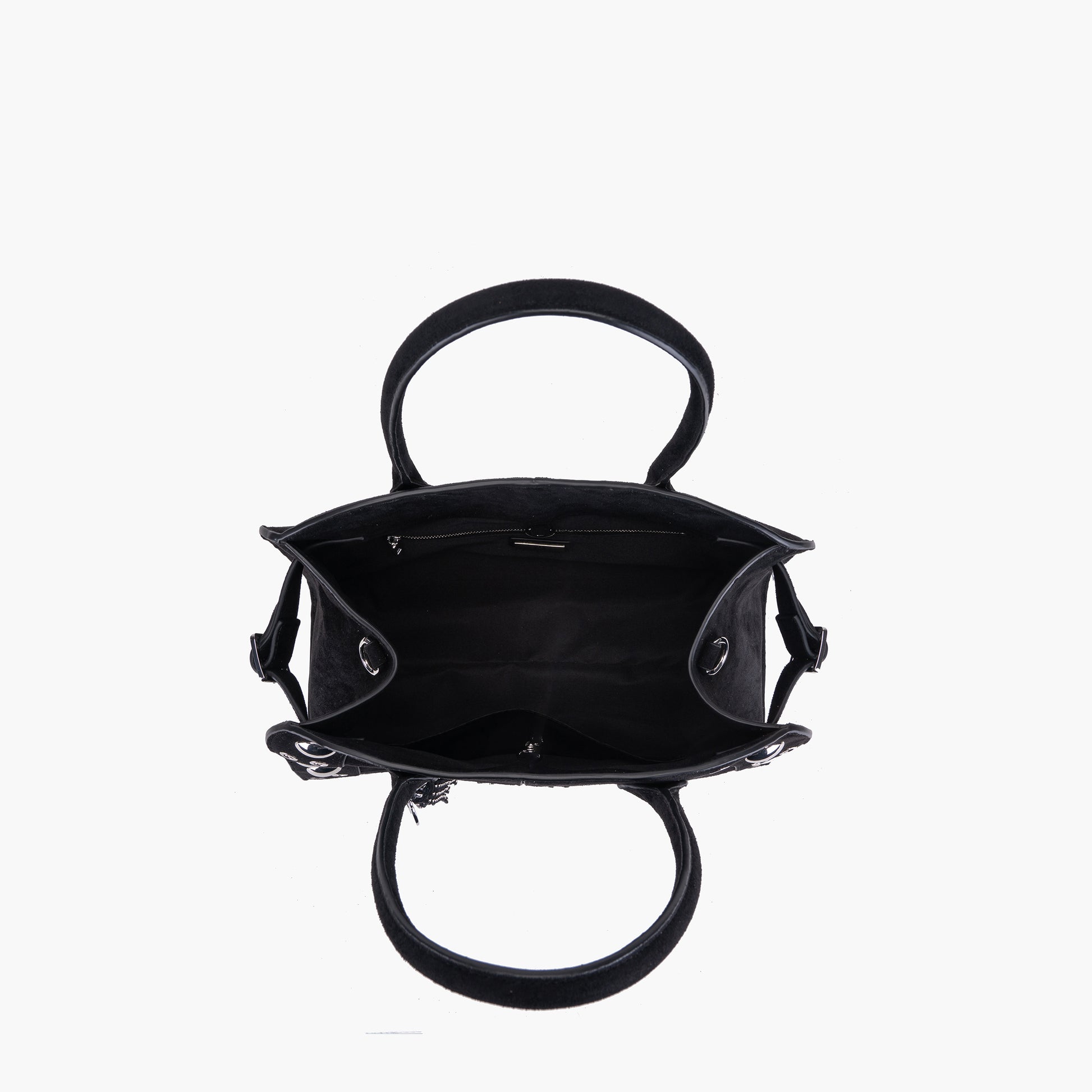 Suede shopping bag with silver eyelets and studs, double handles and removable shoulder strap