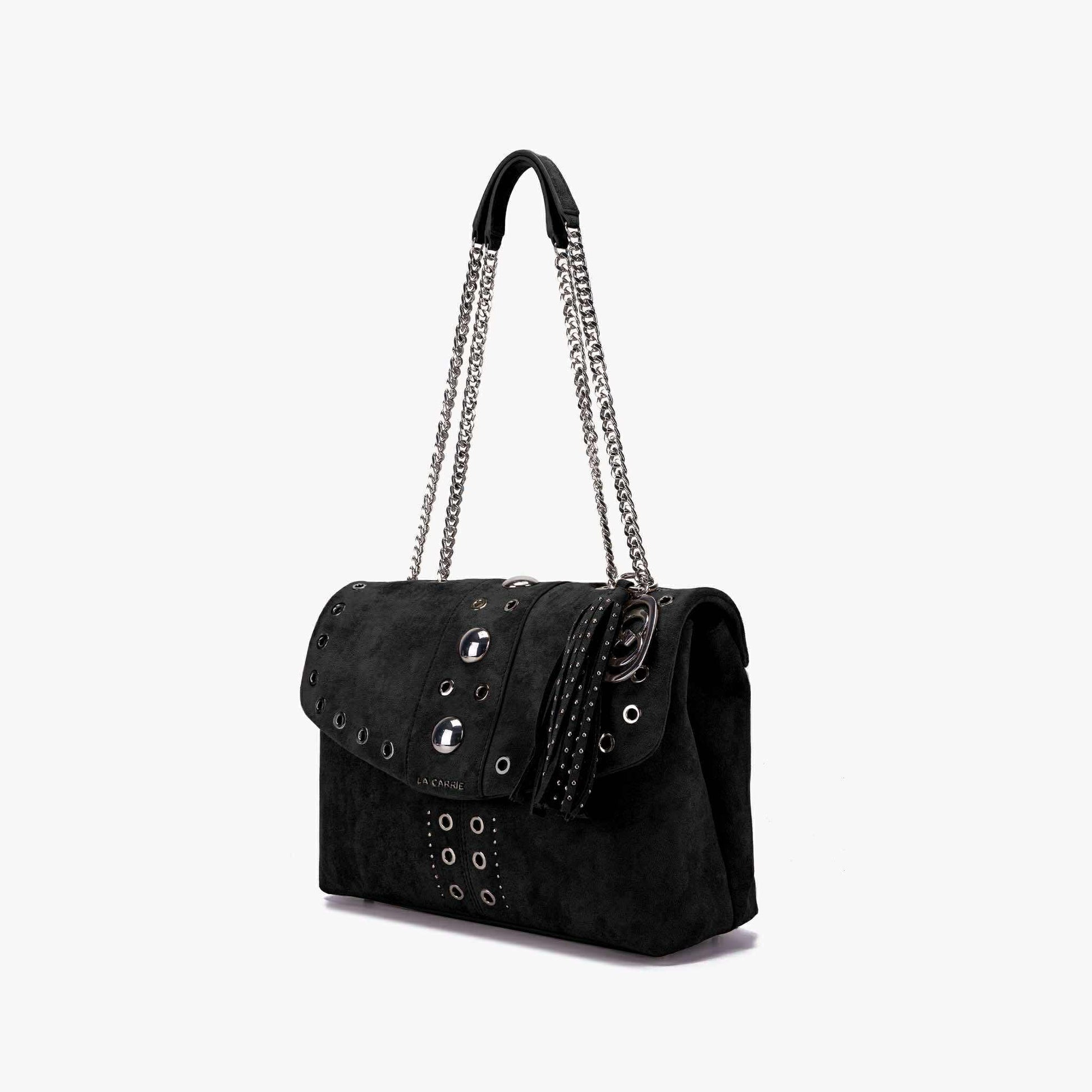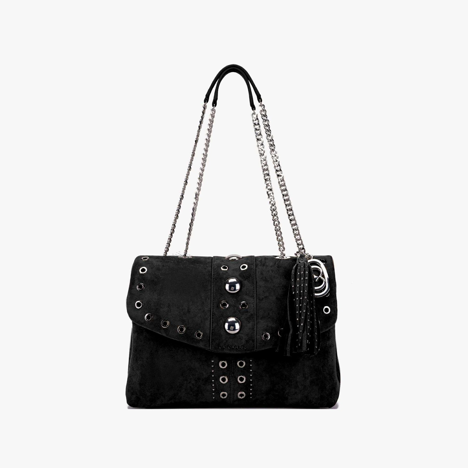 Borsa a spalla in suede con occhielli e borchie in argento, due manici in catena